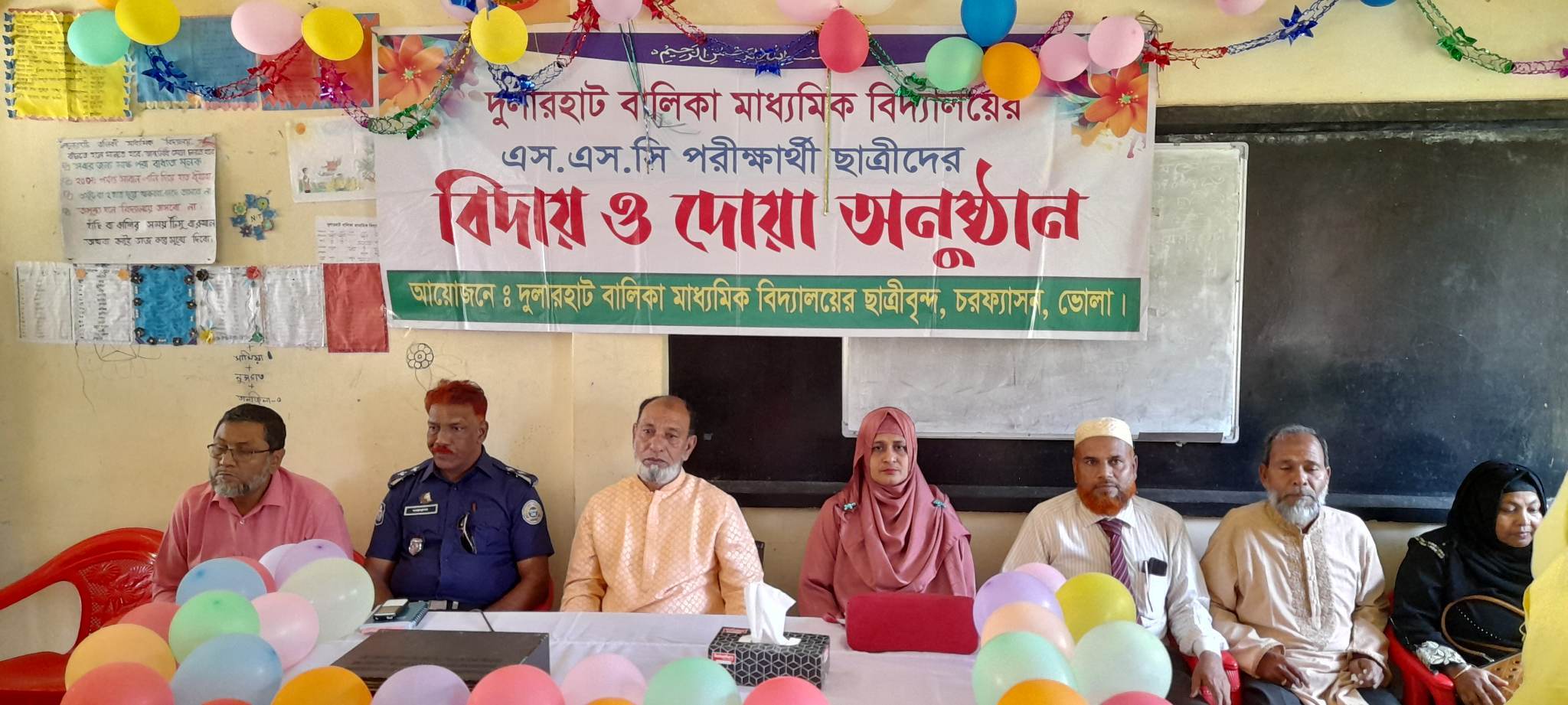 ভোলার চরফ্যাশন উপজেলার দুলারহাট বালিকা মাধ্যমিক বিদ্যালয়ের ২০২৩ ইং সালের এসএসসি পরীক্ষার্থীদের বিদায় ও দোয়া অনুষ্ঠান অনুষ্ঠিত হয়েছে। মঙ্গলবার (২১ মার্চ) সকাল ১০ টায় অত্র বিদ্যালয়ের মিলনায়তনে অনুষ্ঠিত হয়।