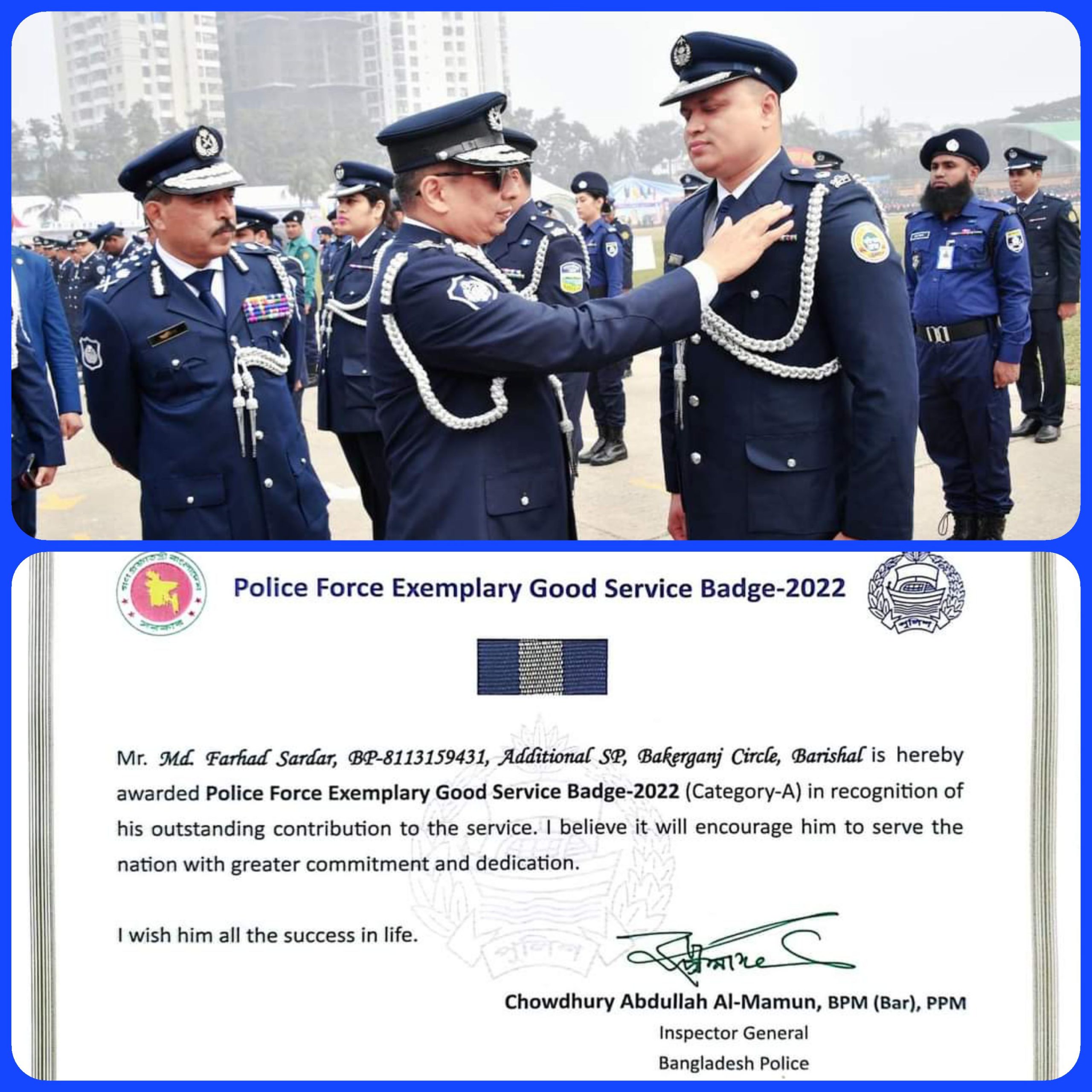 কর্মক্ষেত্রে অসাধারণ কৃতিত্বের স্বীকৃতি স্বরূপ আইজি ব্যাজ পুরস্কারে ভূষিত হলেন ফরহাদ সরদার।