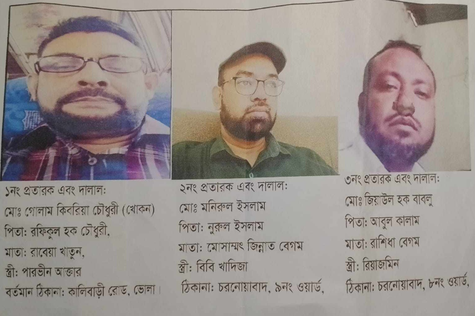 মামলার বাদী মোঃ মহিউদ্দিন সূত্রে জানা যায়, ভোলার ভেদুরিয়ায় চাকুরীর ভুয়া নিয়োগপত্র দিয়ে অসহায় কাঞ্চন আলীর কাছ থেকে ৬ লক্ষ টাকা হাতিয়ে নিয়েছেন খোকন চৌধুরীর সহ তিন প্রতারক। তারা হলেন গোলাম কিবরিয়া খোকন চৌধুরী, মনিরুল ইসলাম ও জিয়াউল হক বাবলু। এই তিন প্রতারকের খপ্পরে পড়ে চাকুরী জীবনের শেষ সম্বল হারিয়ে প্রায় নিঃস্ব হয়ে পড়েছেন বিআইডব্লিউটিএর অবসরপ্রাপ্ত কর্মকর্তা কাঞ্চন আলীর পরিবার।