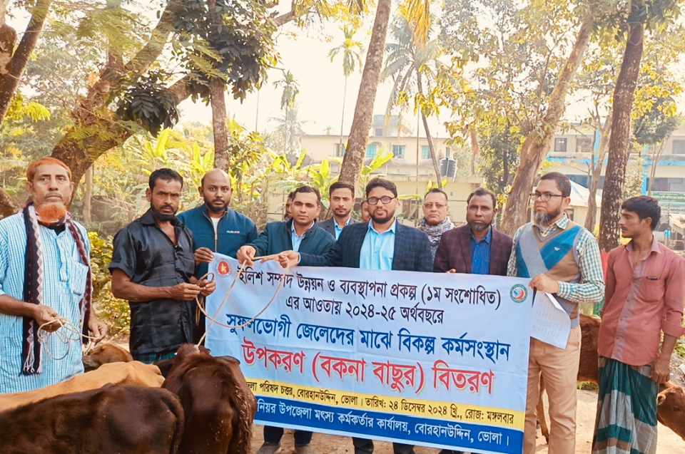 ভোলার বোরহানউদ্দিনে বিকল্প কর্মসংস্থানের লক্ষ্যে অসহায়-দুঃস্থ প্রান্তিক ৩২ জন জেলের মাঝে বকনা বাছুর বিতরণ করা হয়েছে।