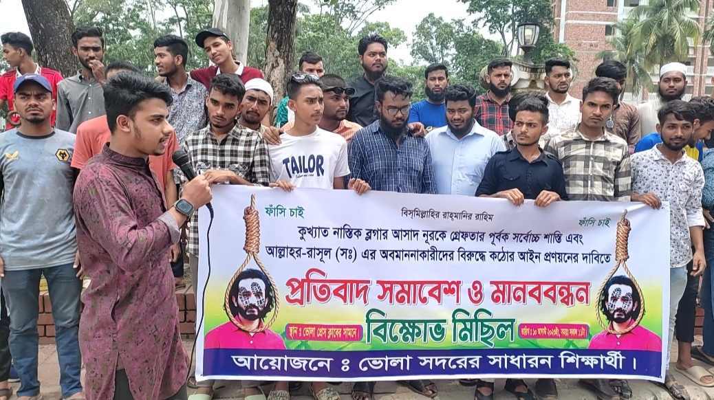 বৃহস্পতিবার (১০ আগস্ট) সকাল ১১টায় ভোলা প্রেসক্লাবের সামনে এই মানববন্ধন কর্মসূচি অনুষ্ঠিত হয়। সাধারণ শিক্ষার্থীদের ব্যানারে ভোলা সরকারি কলেজ, নাজিউর রহমান কলেজ, ওবায়দুল হক কলেজ, ভোলা সরকারি উচ্চ বিদ্যালয় সহ জেলা শহরের প্রায়সংখ্যক প্রতিষ্ঠানের শিক্ষার্থীরা অংশগ্রহণ করেন। শিক্ষার্থীদের এই কর্মসূচিকে স্বাগত জানিয়ে একাত্মতা প্রকাশ করে মানববন্ধনে অংশ নেয় ভোলা জেলা ছাত্রলীগের সভাপতি রাইহান আহমেদ ও ভোলা সদর উপজেলা ছাত্রলীগের সাধারণ সম্পাদক সালমান গোলদার। বিক্ষোভ সমাবেশে মোঃ আরিফ আহমেদ'র সঞ্চালনায় বক্তব্য রাখেন ভোলা সরকারি কলেজের শিক্ষার্থী মোঃ ওসমান সোহাগ, মোঃ রাহিম, আহমেদ আকবর, মোঃ রাহাত, ফাহিম মুনতাসীর, রিপন চৌধুরী, শাকিবুল ইসলাম। এসময় শিক্ষার্থীরা বলেন, মহানবী (সা.) কে নিয়ে অবমাননাকর ভিডিও তৈরি করে ব্লগার আসাদ নূর মুসলমানের হৃদয়ে আঘাত করছে। ধর্মীয় শান্তি বিনষ্টের দায়ে এই ব্লগারকে অবিলম্বে গ্রেফতার করে সর্বোচ্চ শাস্তির জোর দাবি জানাই।