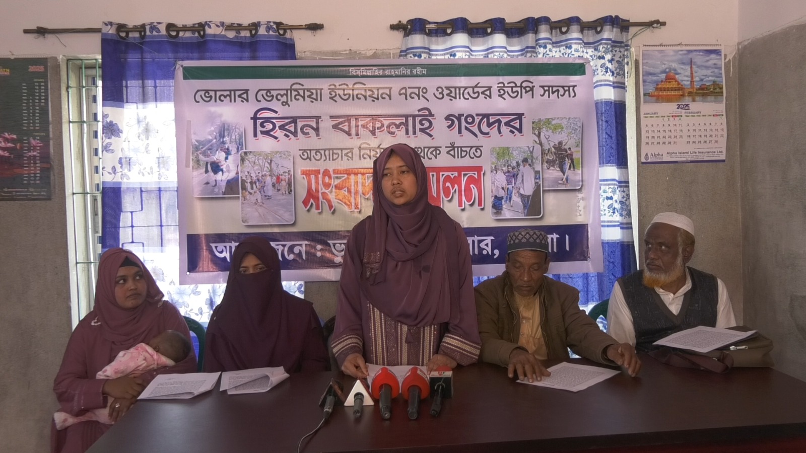 ভোলা সদর উপজেলার ভেলুমিয়া ইউনিয়নের ৭ নম্বর ওয়ার্ডের ইউপি সদস্য হিরন বাকলাই ও তার ভাইদের বিরুদ্ধে জমি জবরদখল, অসদাচরণ ও নারীদেরকে শ্লীলতাহানির অভিযোগ তুলে সংবাদ সম্মেলন করেছেন ইউনূস ডাকুয়া নামের এক ভুক্তভোগীর পরিবার।