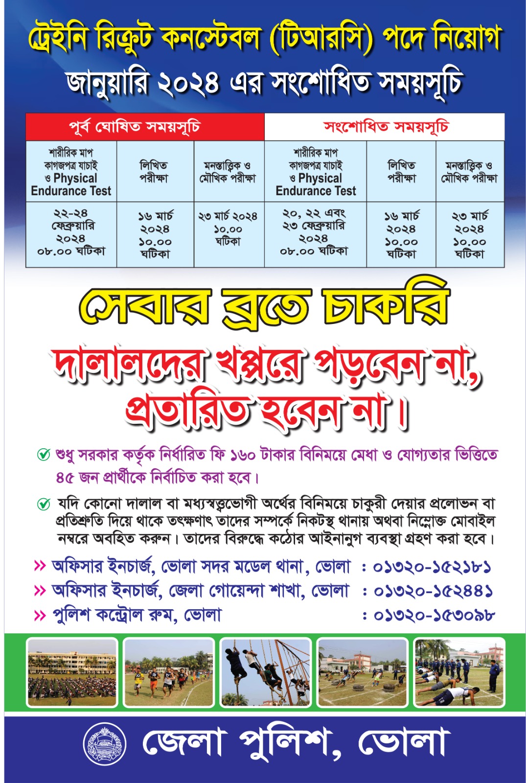 ভোলায় পুলিশের ট্রেইনি রিক্রুট কনস্টেবল (টিআরসি) পদে নিয়োগের সংশোধিত সময়সূচি প্রকাশ