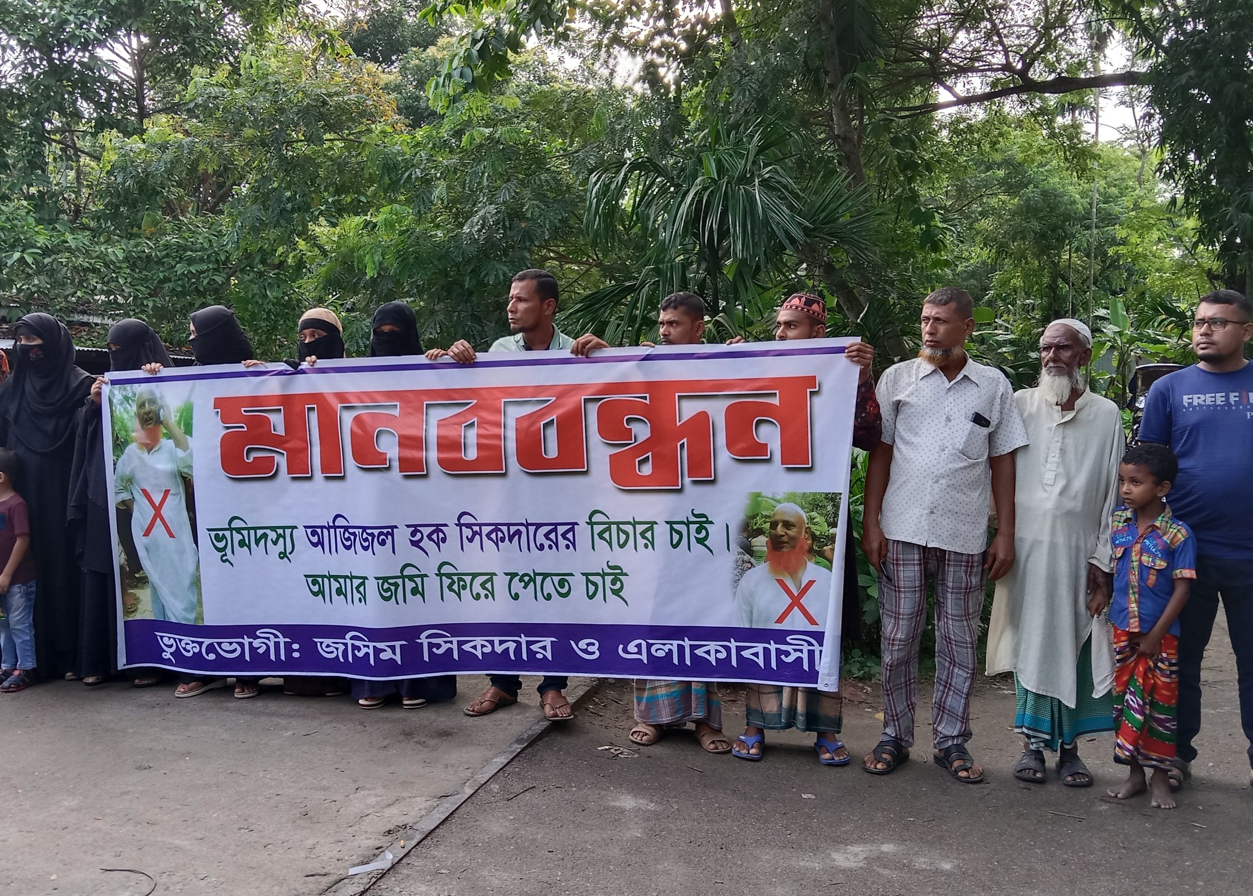 এসময় বক্তারা অভিযোগ করে বলেন, ভূমিদস্যু আজিজুল হক সিকদার জাল কাগজ তৈরি করে এলাকার নিরীহ মানুষের জমি দখলে নিয়ে ভোগদখল করছে। এতে ভুক্তভোগীরা প্রতিবাদ করলে উল্টো নানা প্রকার হয়রানি করে। এই ভূমিদস্যুর হাত থেকে রক্ষা পেতে প্রশাসনের সহায়তা চান ভুক্তভোগী এলাকাবাসী।