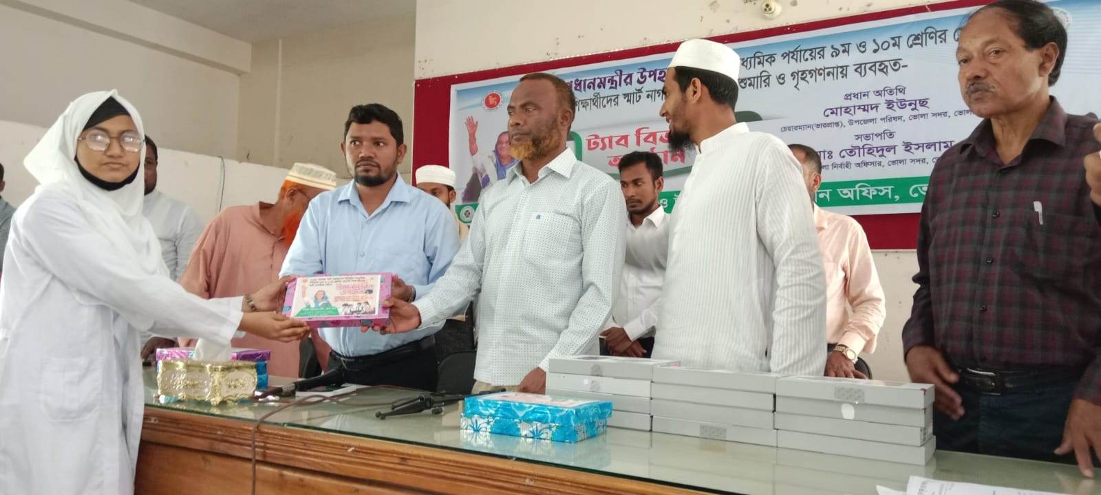 ভোলায় মাননীয় প্রধানমন্ত্রীর উপহার হিসেবে মাধ্যমিক পর্যায়ের নবম ও দশম শ্রেণীর মেধাবী শিক্ষার্থীদের স্মার্ট নাগরিক গঠনে ভোলা সদর উপজেলার ৫৪ টি মাধ্যমিক বিদ্যালয়ের মধ্যে ৩২৪ জন প্রথম, দ্বিতীয় ও তৃতীয় স্থান অধিকারী শিক্ষার্থীদের মাঝে গতকাল মঙ্গলবার সকাল দশটায় উপজেলা পরিষদের হলরুম এই ট্যাব বিতরণ করা হয়।