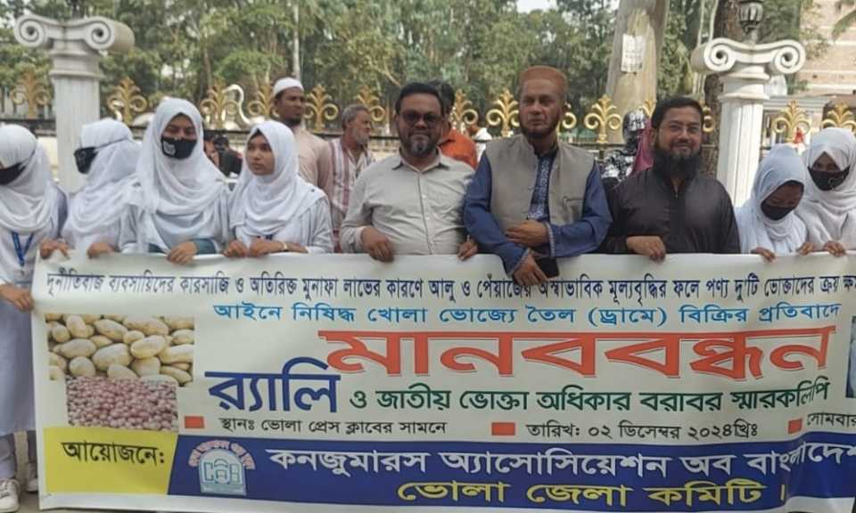 সবজি এবং ভোজ্য তেলের মূল্যবৃদ্ধি ভোলায় ক্যাব এর মানববন্ধন