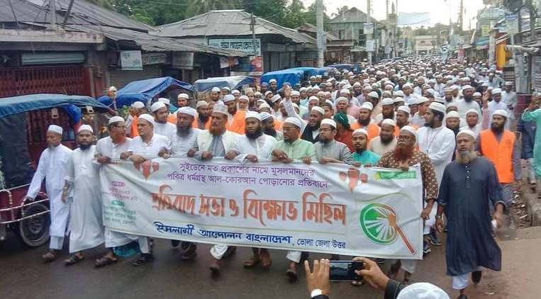 সুইডেনে পবিত্র কোরআন পোড়ানোর ঘটনায় ভোলায় ইসলামী আন্দোলনের মিছিল।