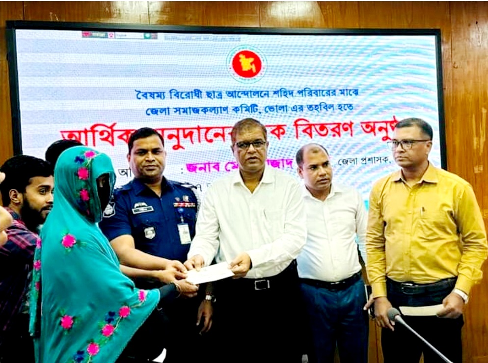 ভোলায় জেলা প্রশাসনের উদ্যোগে বৈষম্যবিরোধী ছাত্র জনতার আন্দোলনে শহিদ পরিবারের মাঝে চেক বিতরণ