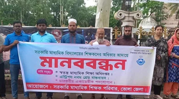 আশিকুর রহমান শান্ত ভোলা প্রতিনিধিঃ সরকারি মাধ্যমিক বিদ্যালয়ের শিক্ষকদের এন্ট্রিপদ ৯ম গ্রেড ধরে চার স্তরীয় একাডেমিক পদসোপান চেয়ে ভোলায় মানববন্ধন অনুষ্ঠিত হয়েছে । বুধবার (২০ আগস্ট) দুপুর ১২ টা ১৫