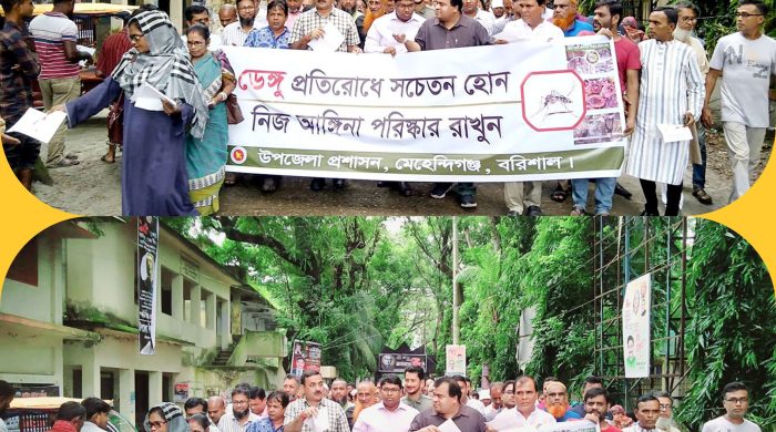 সঞ্জয় গুহ মেহেন্দিগঞ্জ বিশেষ  প্রতিনিধিঃ ডেঙ্গু প্রতিরোধে সচেতন হোন,নিজ আঙ্গিনা পরিস্কার রাখুন। এই শ্লোগানকে সামনে রেখে বুধবার দুপুরে মেহেন্দিগঞ্জ উপজেলা প্রশাসন আয়োজিত সচেতনতামূলক র‌্যালি, লিফলেট বিতরণ ও আলোচনা সভা অনুষ্ঠিত